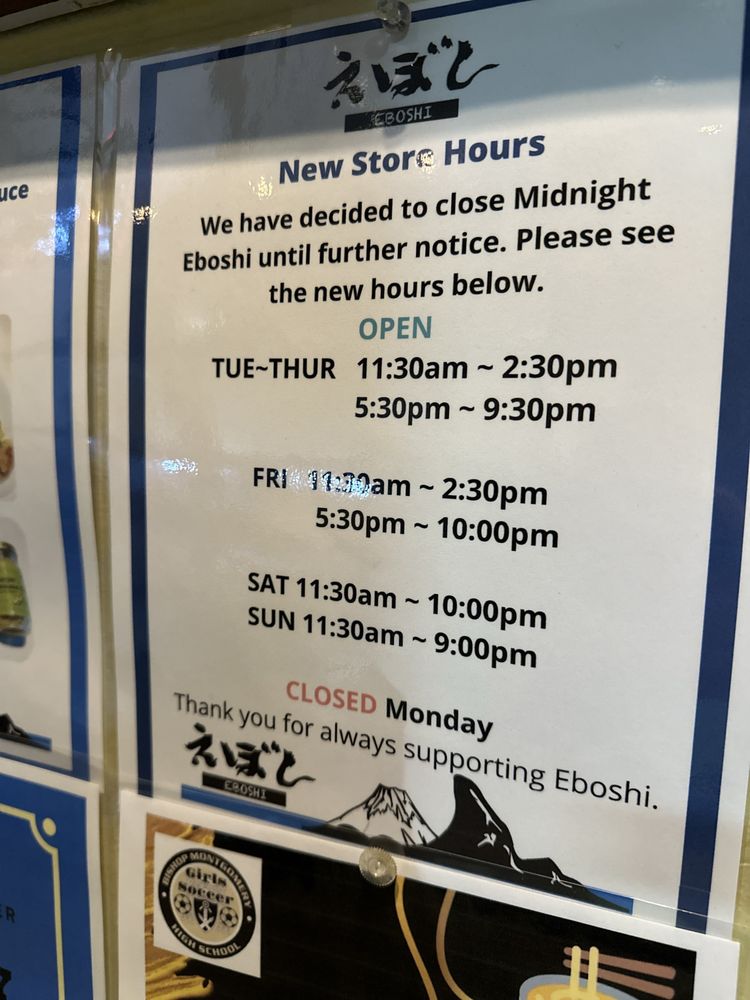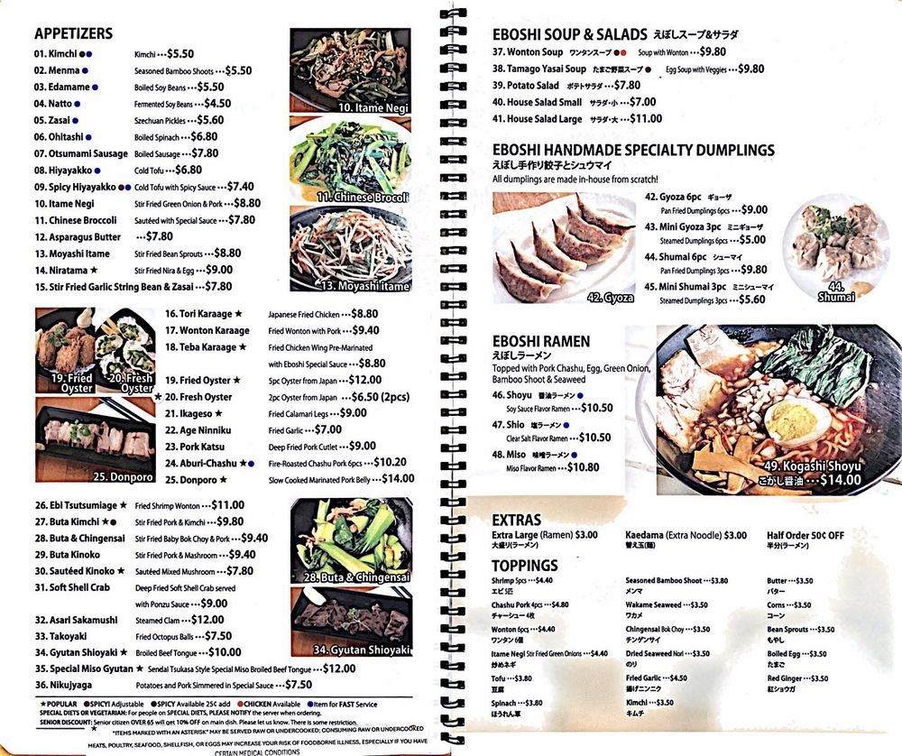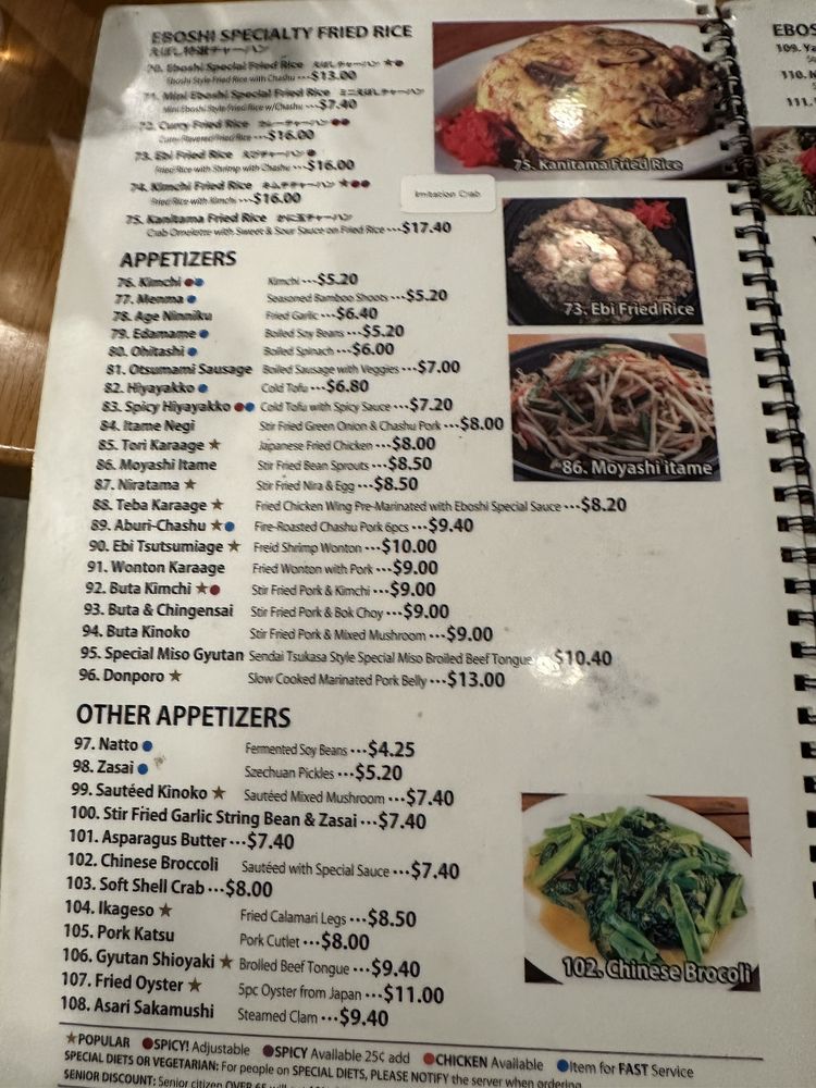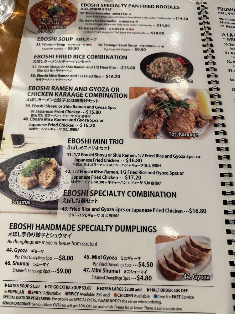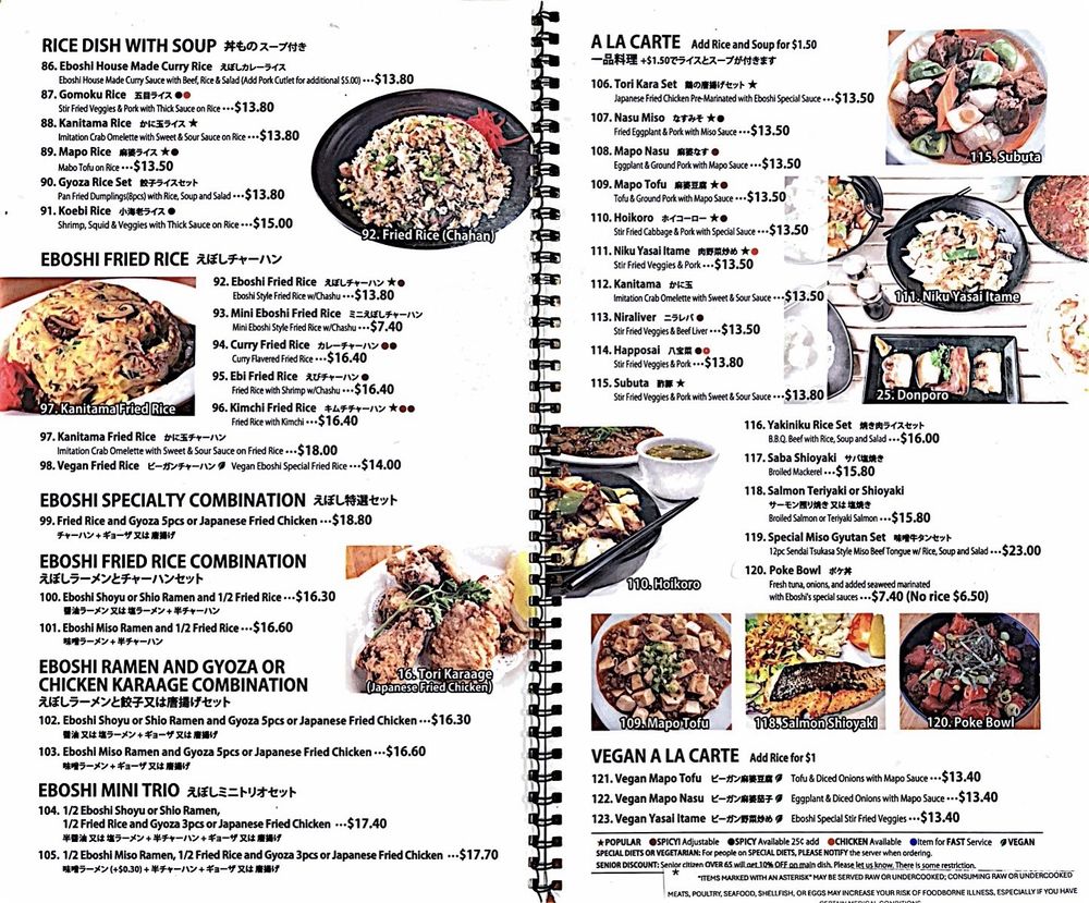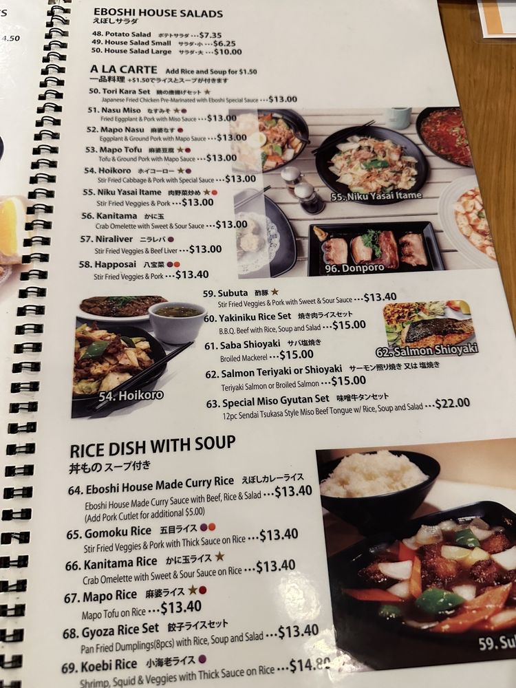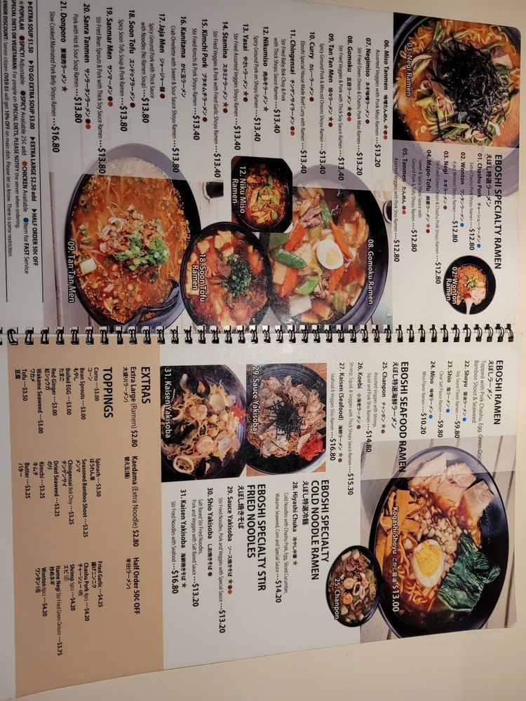 "Introducing the menu at Eboshi Ramen Bar, a cozy Asian-owned restaurant in Lomita, CA, offering a wide range of appetizers including Edamame, Buta Kimchi, and Hiyayakko. The menu also features Eboshi Soup options like Wonton Soup and Tamago Yasai Soup. Customers rave about the large portions, delicious food, and affordable prices. The Mountain of Mapo Tofu and Combination dishes are highly recommended. Some customers note the unique sweet flavors in certain dishes and the friendly service. With options for pescatarians, vegans, and those looking for soy-free or vegetarian choices, Eboshi Ramen Bar provides a diverse and satisfying dining experience. Whether you're looking for a quick bite or a leisurely meal, this restaurant welcomes all and promises a memorable dining experience."